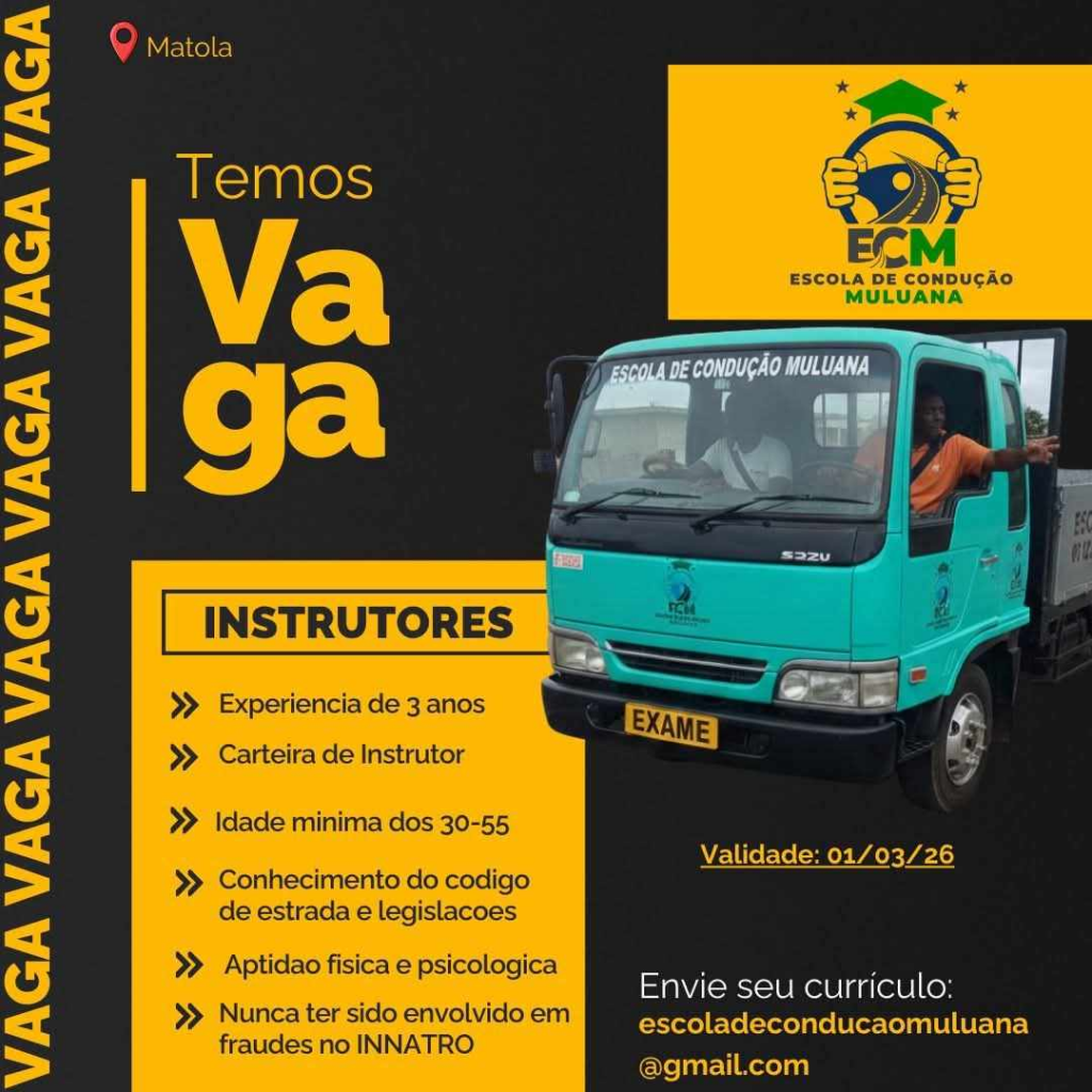 Escola de Condução Muluana, instituição que está prestes a iniciar as suas atividades, encontra-se em fase de constituição do seu quadro de pessoal e está a recrutar 02 (dois) Instrutores de Condução para integrar a sua equipa.