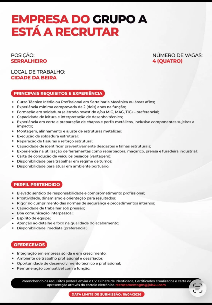 Preenchendo os requisitos poderá enviar o CV, Bilhete de Identidade, Certificados atualizados e carta de apresentção através do correio eletrónico recrutamentogm@job4u.com