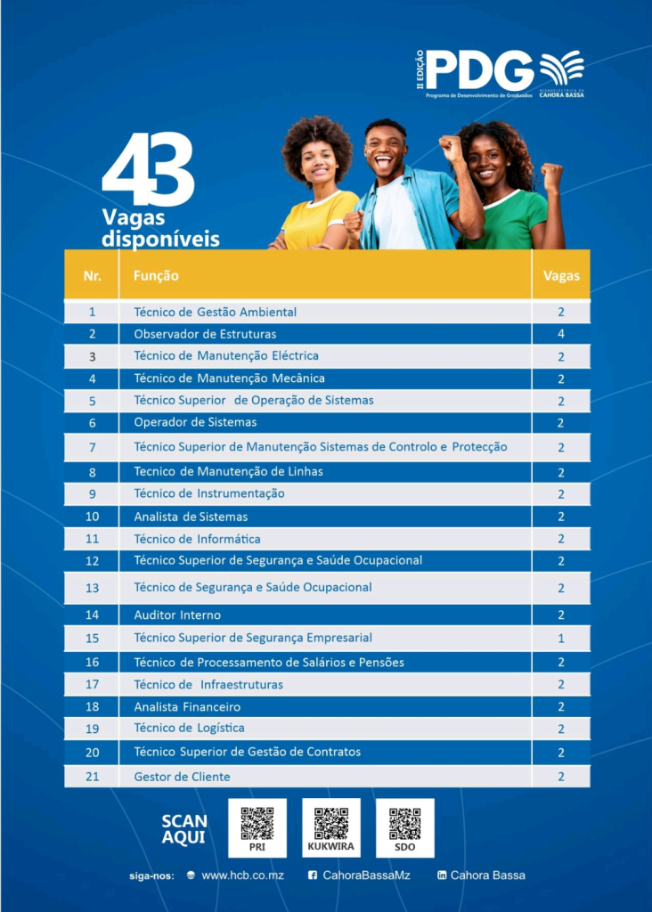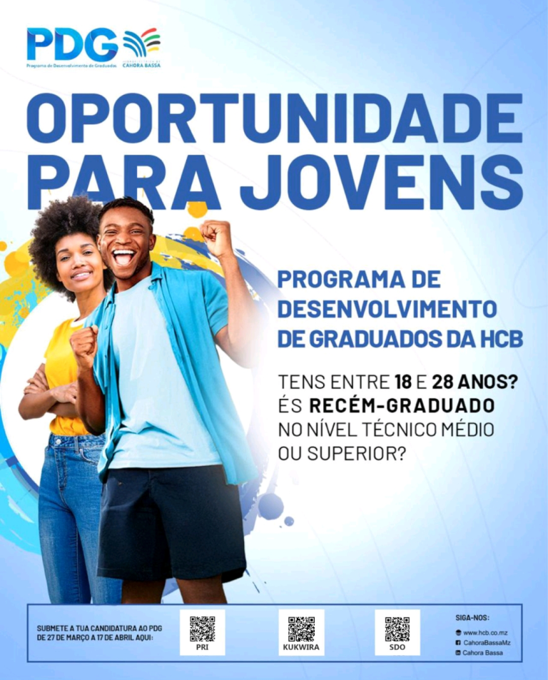 A Hidroeléctrica de Cahora Bassa (HCB) abre as portas para jovens talentos como tu, através do Programa de Desenvolvimento de Graduados (PDG) II Edição uma oportunidade única para iniciar a tua jornada profissional numa das maiores empresas energéticas de Moçambique.