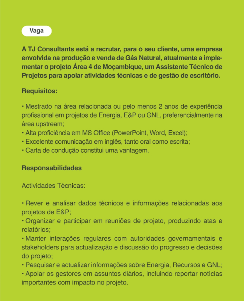 Está aberta uma excelente oportunidade para a função de Assistente Técnico de Projecto na área de Energia, Exploração & Produção (E&P) e GNL, para trabalhar em Maputo.