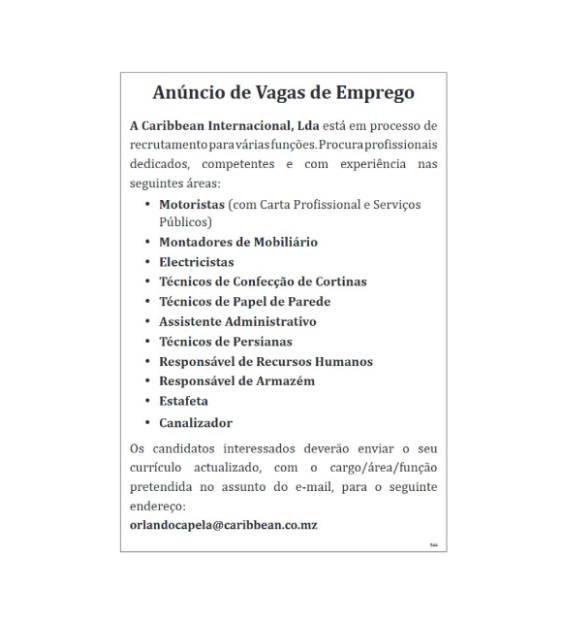 A Caribbean Internacional, Lda está em processo de recrutamento para várias funções.
