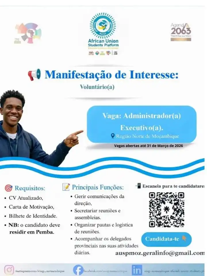 A AUSP Moçambique convida todos os jovens dinâmicos, comprometidos e com espírito de liderança a submeterem a sua manifestação de interesse para a vaga de Administrador(a) Executivo(a) – Região Norte.
