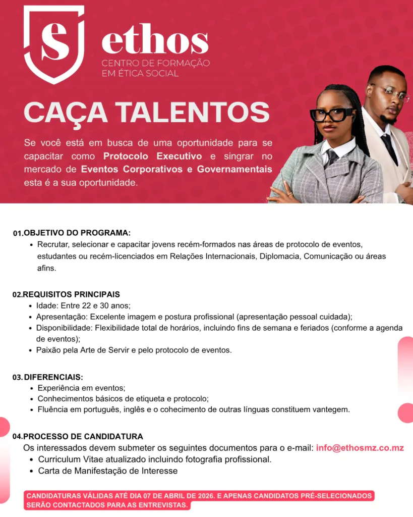 O Centro de Formação Ethos informa que se encontram abertas as candidaturas para o programa “Caça Talentos”, destinado à capacitação de jovens interessados em atuar na área de protocolo executivo, eventos corporativos e governamentais.