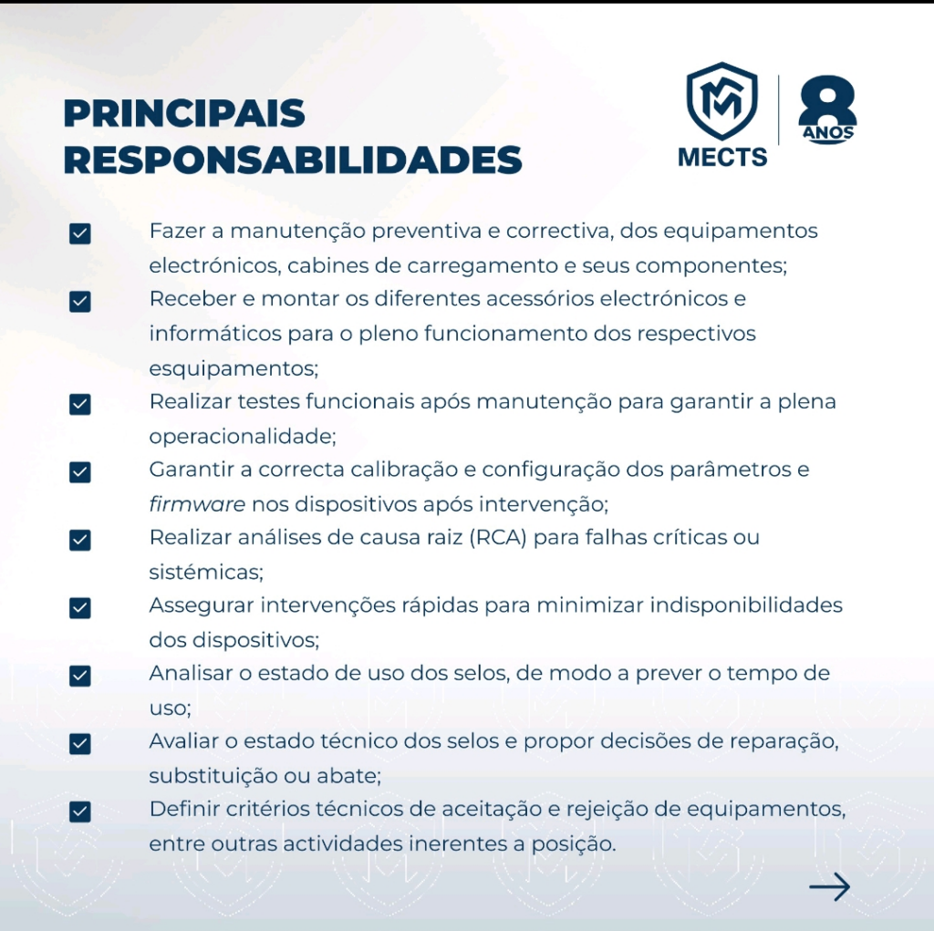 - Fazer a manutenção preventiva e correctiva, dos equipamentos electrónicos, cabines de carregamento e seus componentes;