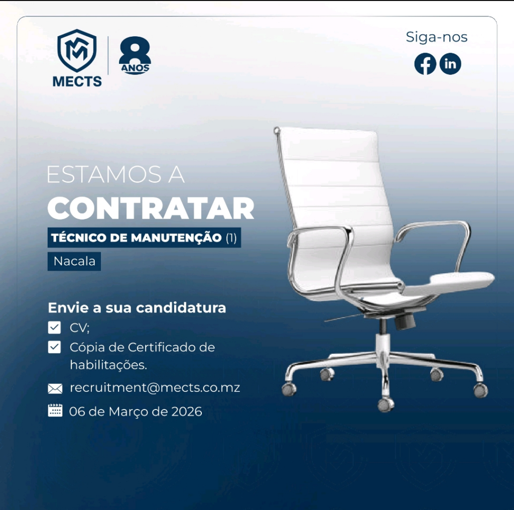 Caso reúna as exigências da vaga, envie a sua candidatura (CV e Cópia de Certificado de Habilitações) para recruitment@mects.co.mz até 06 de Março de 2026.