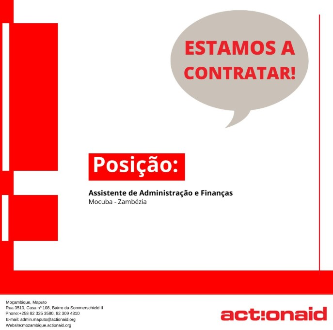 A Associação ActionAid Moçambique (AAMoz) pretende recrutar um(a) candidato(a) qualificado(a), competente e dinâmico(a) para preencher a vaga de Assistente de Administração e Finanças, baseado(a) no distrito de Mocuba, província da Zambézia.