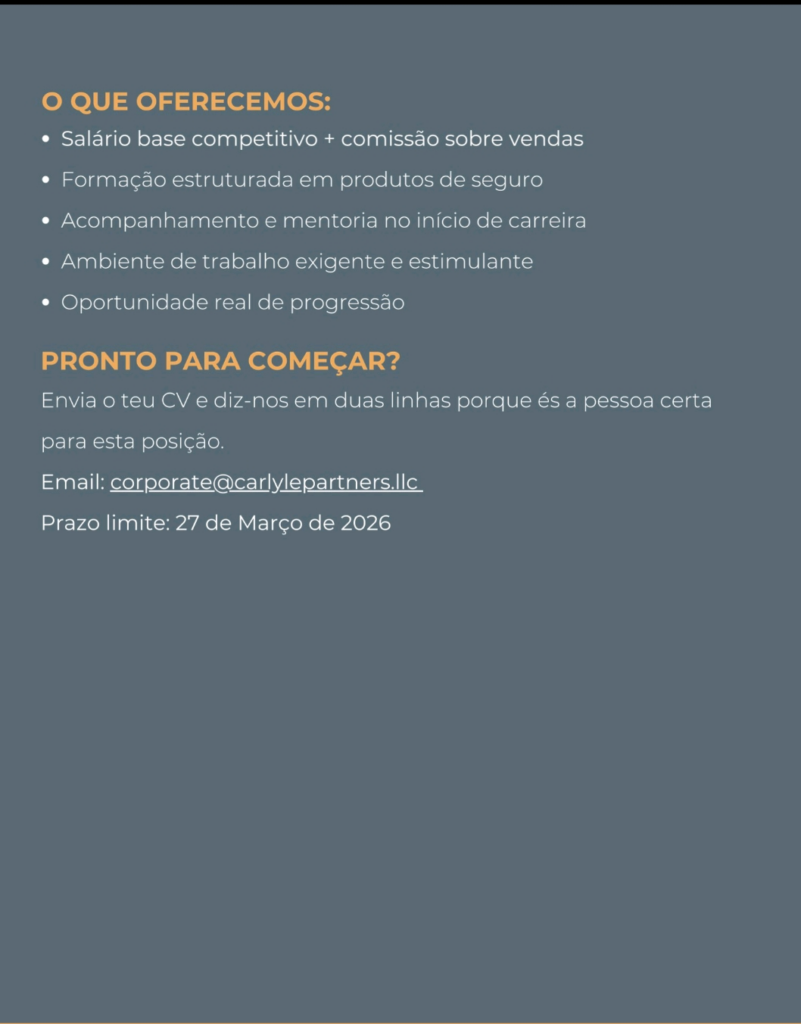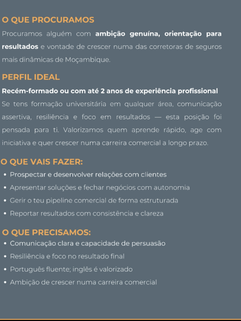 A Carlyle Partners está à procura de talentos com ambição genuína, orientação para resultados e vontade de crescer numa das corretoras de seguros mais dinâmicas de Moçambique