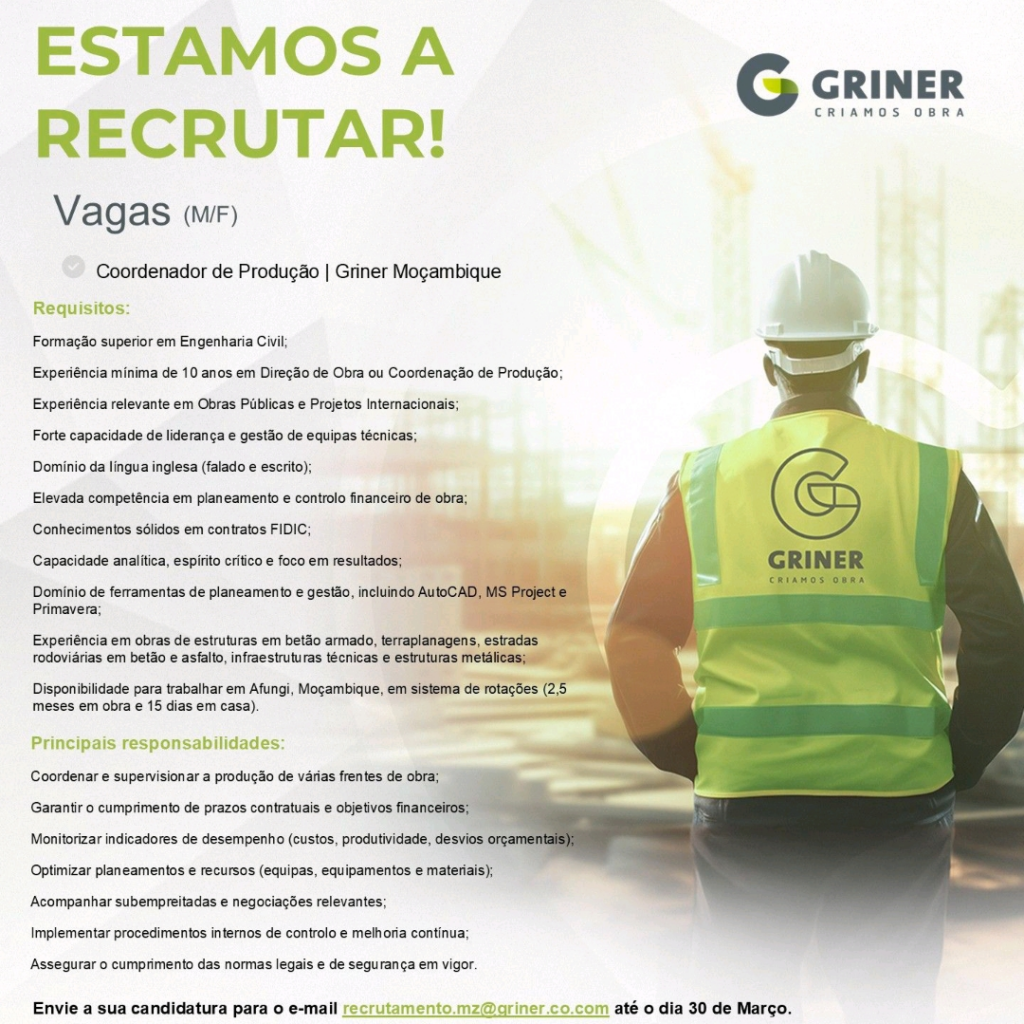 Envie a sua candidatura para o e-mail recrutamento.mz@griner.co.com até dia 30 de Março.