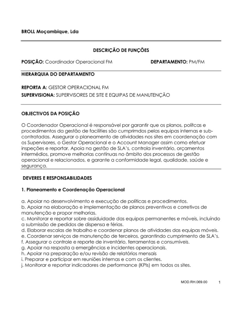 - O Coordenador Operacional é responsável por garantir que os planos, polítcas e procedimentos da gestão de facilities são cumprimdos pelas equipas internas e sub-contratadas.