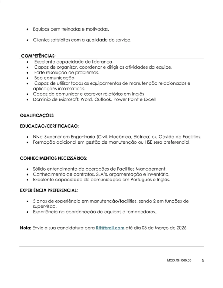 Nota: Envie a sua candidatura para RH@broll.com até dia 03 de Março de 2026