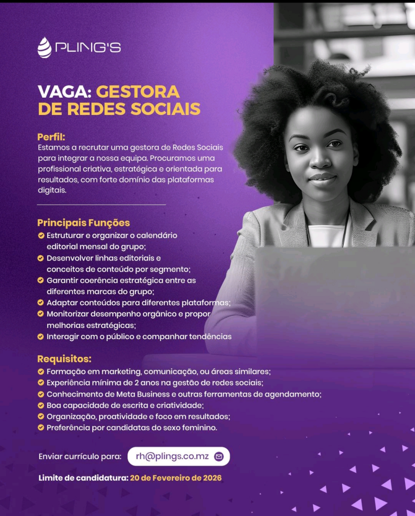O Grupo Plings encontra-se em processo de recrutamento de uma Gestora de Redes Sociais, responsável pela estruturação estratégica do conteúdo digital do grupo.