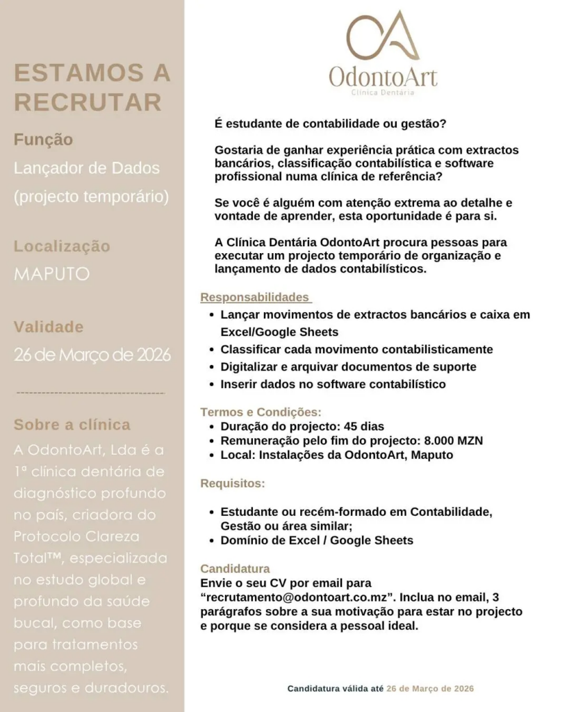 A Clínica Dentária OdontoArt procura pessoas para executar um projecto temporário de organização e lançamento de dados contabilísticos.