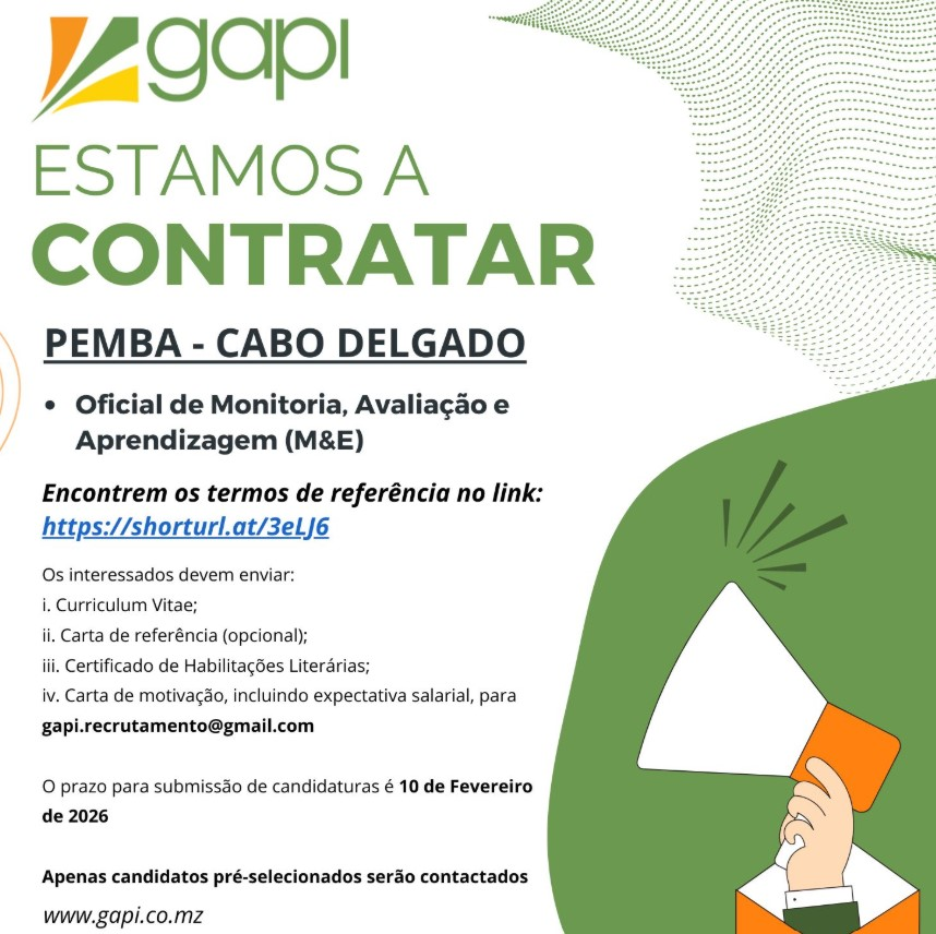 A Gapi – Sociedade de Investimentos, no âmbito do Programa AgroVida, está a recrutar um(a) Oficial de Monitoria, Avaliação e Aprendizagem (M&E) para Pemba, província de Cabo Delgado.