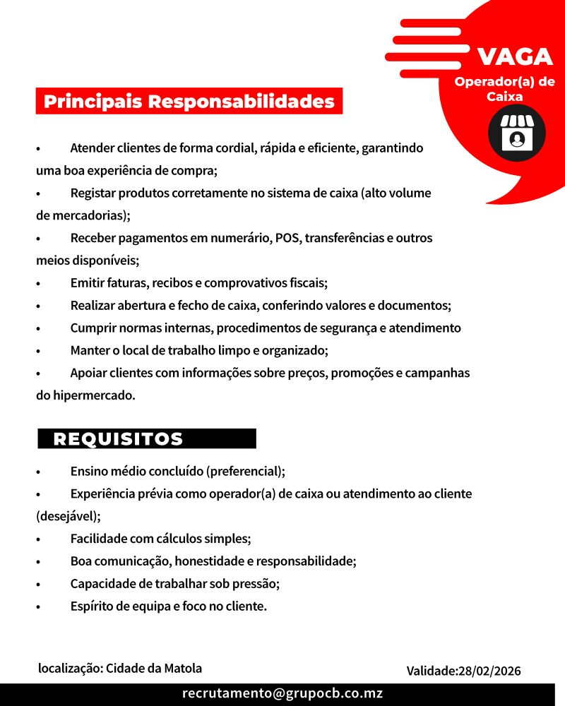 Envie a sua candidatura para o e-mail: recrutamento@grupocb.co.mz