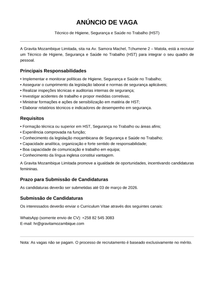 A Gravita Moçambique Limitada, localizada na Av. Samora Machel, Tchumene 2 – Matola, está recrutar um Técnico de Higiene, Segurança e Saúde no Trabalho (HST) para integrar o seu quadro pessoal.
