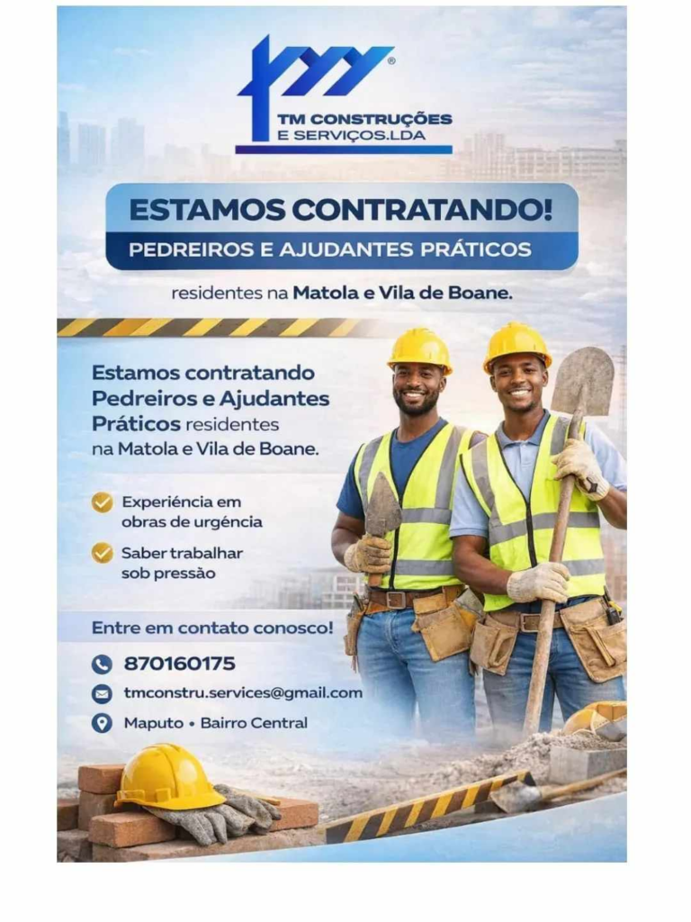 Estamos contratando Pedreiros e Ajudantes Práticos residentes na Matola e Vila de Boane.