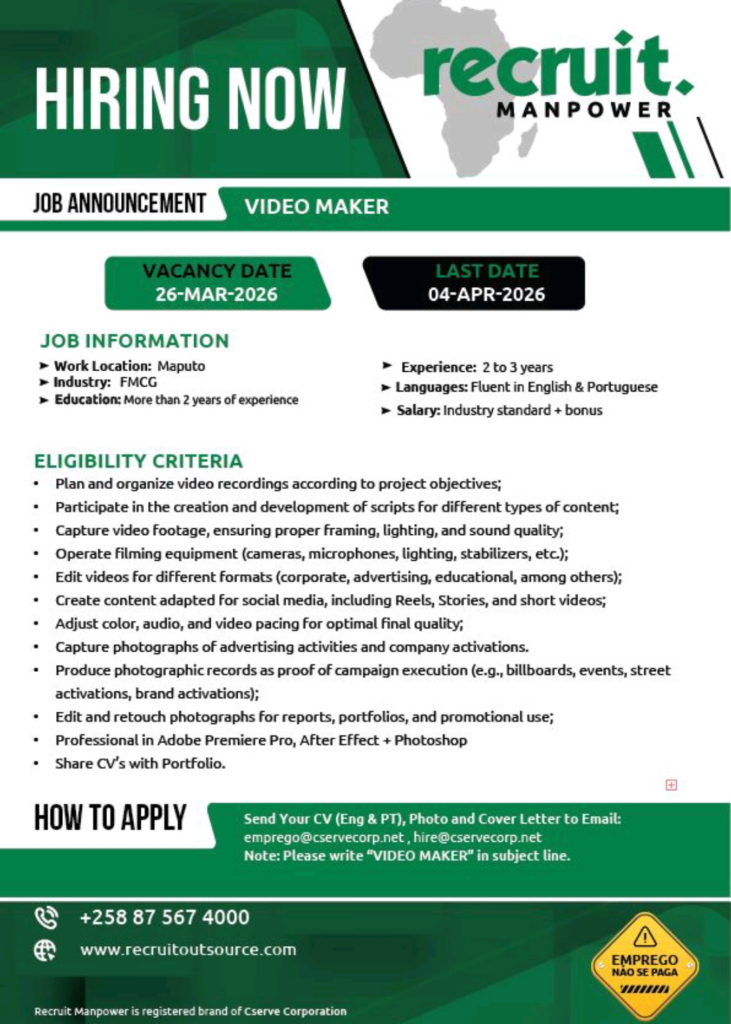 Send your CV (ENG & PT), Photo and Cover Letter to Email: